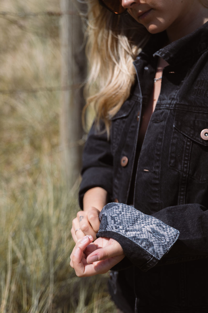 Roll back the cuffs, and you'll discover a touch of wildness: a snake print detail on the inner lining, symbolizing transformation and resilience. The rich contrast between the structured black denim and the organic pattern underlines a sense of duality—strength and softness, style and edge.