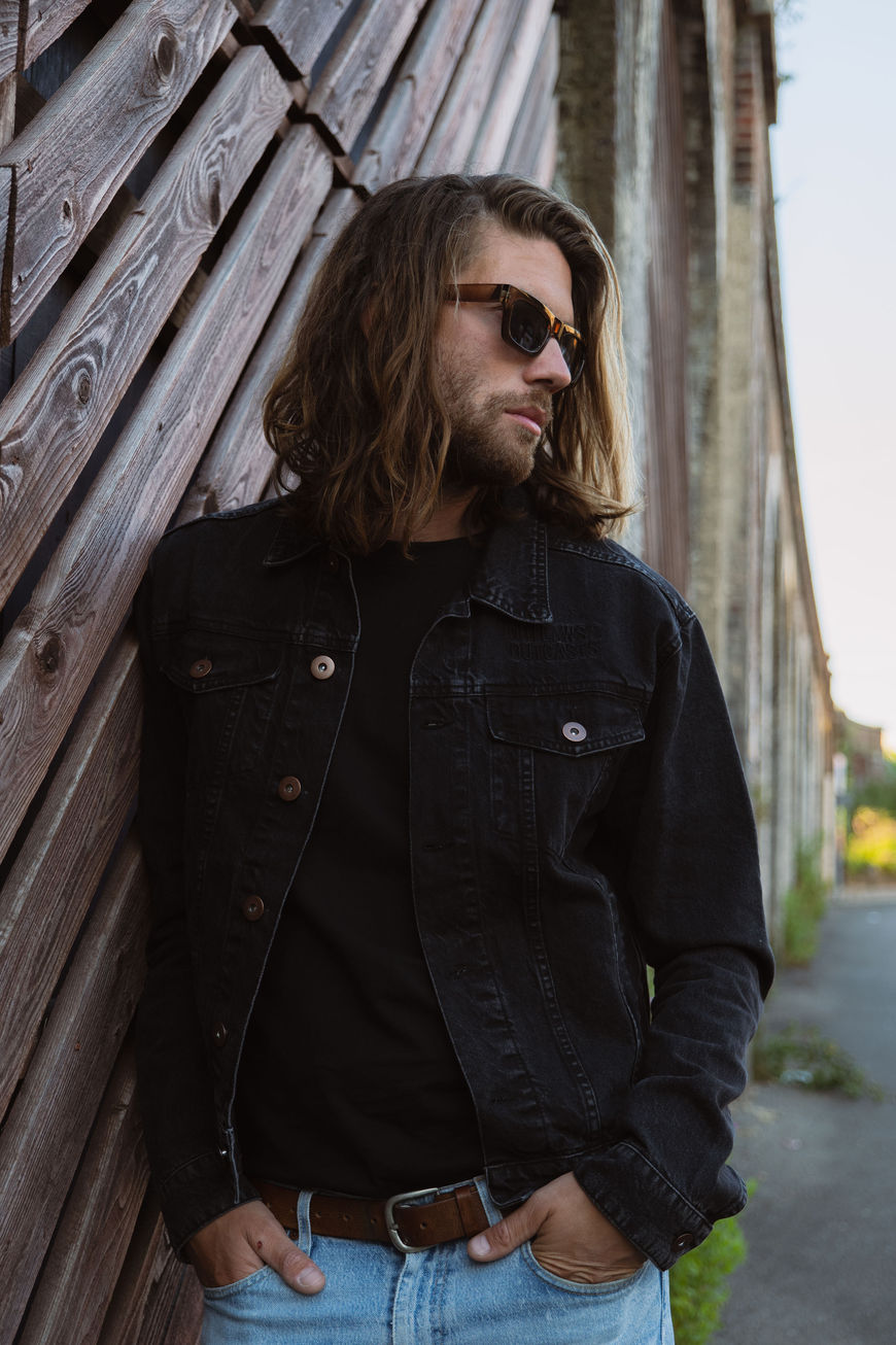 This bold, all-black denim jacket from Outlaws & Outcasts stands as a statement piece that features a subtle black-on-black embroidered logo on the chest and back quarter. With a slim, modern fit and durable design. Subtle distressing adds a worn-in look and a rugged edge.