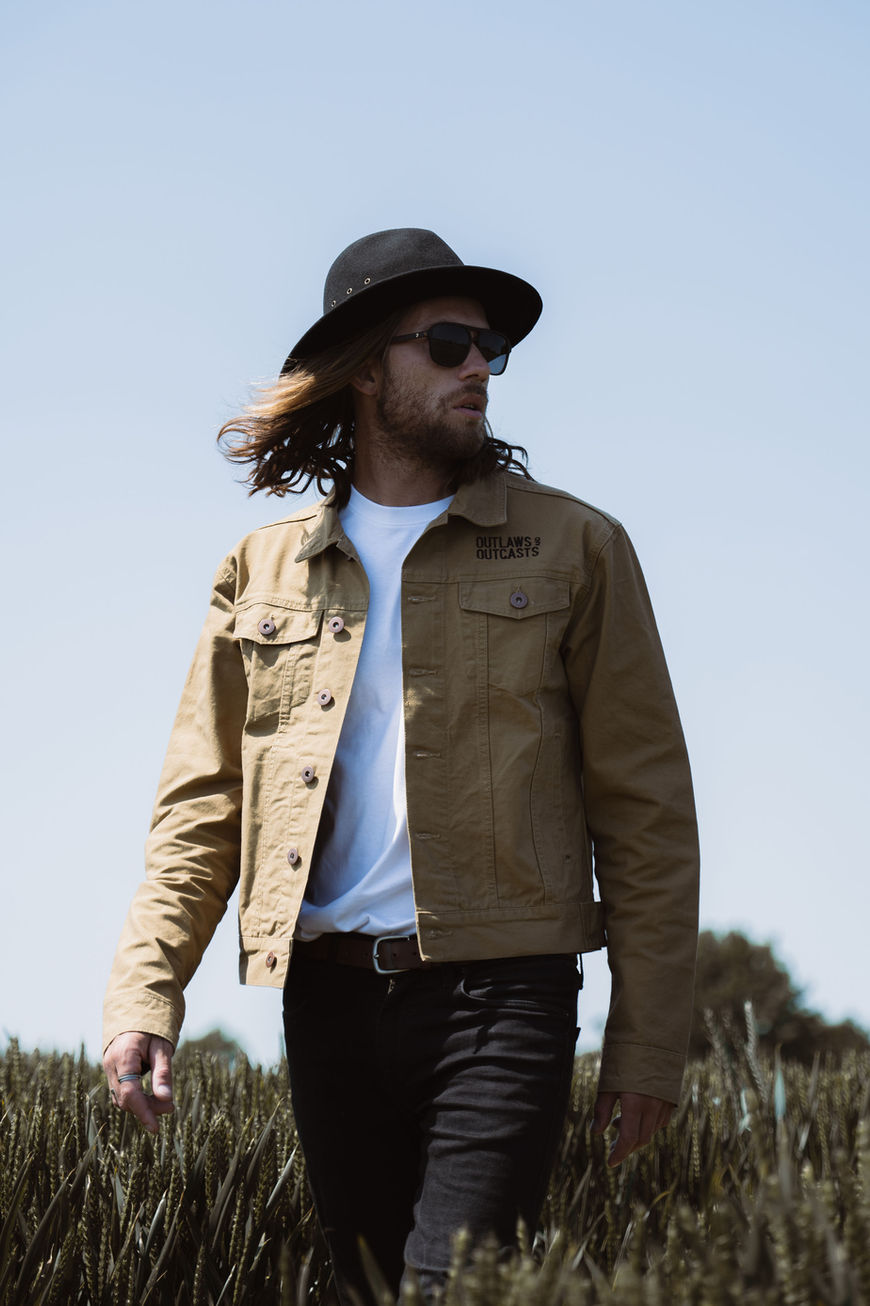 Introducing the Sahara Denim Jacket – a timeless piece combining rugged charm with exquisite detailing. Crafted from premium, durable 14oz denim, this jacket boasts a classic Aged Tan hue that complements any ensemble. The standout features include intricate embroidery on the chest, proudly displaying the "Outlaws & Outcasts" emblem, adding a rebellious flair. Additionally, the snakeprint inner cuffs provide an unexpected twist of sophistication, visible when the sleeves are casually rolled up. Designed for practicality and style, this jacket features two chest pockets with button closures and two side pockets, ensuring ample space for your essentials. The tailored cut offers a flattering silhouette, while the button-up front ensures a secure fit.